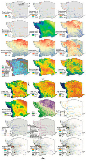 Spatial distribution of explanatory variables of pavement infrastructure performance. (a) Part 1; (b) part 2.