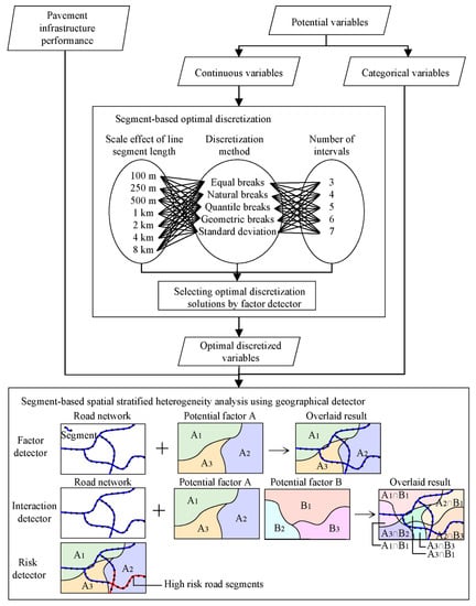 In addition, to the best of our knowledge, this is the first study utilizing the geographical detector to address industrial and engineering problems. Results show that the segment-based geographical detector is suitable and practical in addressing industrial problems with line segment spatial data, such as assessing pavement infrastructure performance. The key reason is that no linear assumptions are required to both response and potential explanatory variables for the geographical detector in exploring their interrelationships []. Meanwhile, both continuous and category spatial data can be used as explanatory variables in spatial stratified heterogeneity analysis, where continuous data are discretized. These characteristics of the geographical detector enable the wide prospects for its application on addressing industrial and engineering problems, and providing quantitative and accurate spatial analysis results for road maintenance decision-making.