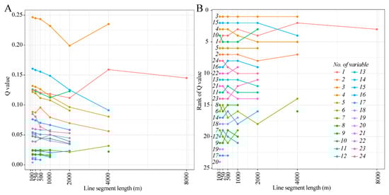 Scale effects of line segment length on Q values (A), and ranks of variables (B).