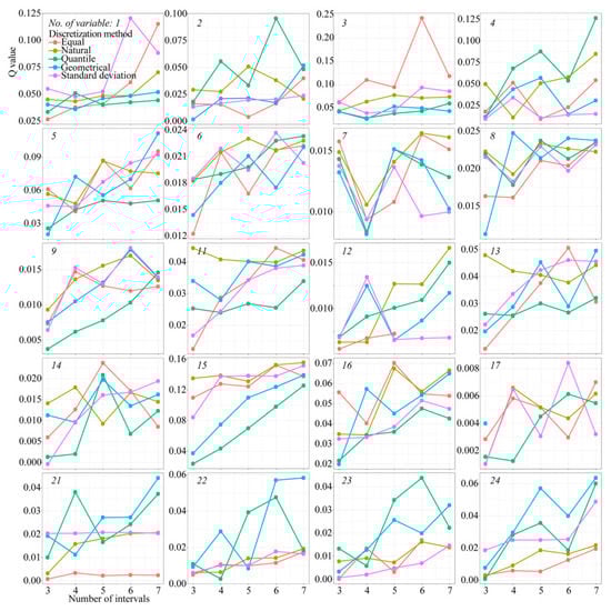 In addition to selecting the optimal length of line segments, the best combinations of discretization methods and numbers of intervals will be determined for discretizing continuous variables. Under the optimal length of line segments, different discretization methods and numbers of intervals can generate various break values. In this study, five commonly used unsupervised discretization methods are utilized for discretizing continuous variables, including equal breaks, natural breaks, quantile breaks, geometric breaks and standard deviation (SD) breaks. The five methods have their respective advantages in dividing the range of data values into specified intervals by considering data range, data distribution, data within or between intervals, and statistical characteristics [,]. All continuous variables are divided into ranges of 3–7 intervals using the five discretization methods. The ranges of 3–7 intervals are proper numbers of intervals for most of the geographical variables, since if the number of intervals is too small, spatial stratified heterogeneity cannot be reflected by the variables, and if they are too large, data will be scattered across space. The relative importance ( values) are computed using a factor detector model for all combinations of discretization methods and numbers of intervals, and the largest values determine the best parameter combinations for discretizing continuous variables.