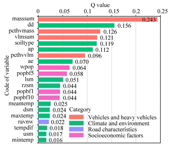 Under the 500-m line segment scenario for segmenting the whole road network in the Wheatbelt region, the segment-based factor detector is performed for all potential variables, including category and discretized segment-level variables. Figure 7 shows the values and their ranks of variables with significant relationships with pavement deflections. The variables that have no significant values are removed. The removed variables include EVI, traffic speed limit and road surface type. In general, variables from the categories of vehicles and heavy vehicles, and climate and environment, make more contributions to the pavement deflections than the variables of road characteristics and socioeconomic factors. All four variables of vehicles and heavy vehicles are among the top-quartile ranks of values. The relative importance of total masses of vehicles () and deep drainage () are much higher than other variables. Weighted population within 50 km () and RAV network () are the variables that have the largest contributions among their respective category of socioeconomic factors and road characteristics.