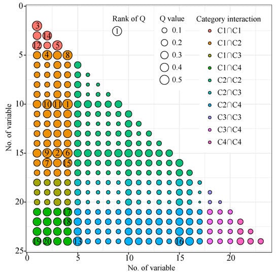 In this study, 276 pairs of interactions among 10 types of category interactions are computed between the 24 potential variables in the 4 categories. Figure 8 shows the impacts of all interactions between potential variables, including variable interactions, category interactions, values and ranks, where the top 20 interactions are marked by the ranks. Table 3 lists the top 20 interactions, which are all nonlinearly enhanced by both variables. The top 20 interactions are identified in the category interactions of (1) vehicles and heavy vehicles (C1∩C1), (2) vehicles and heavy vehicles, and climate and environment (C1∩C2), (3) vehicles and heavy vehicles, and socioeconomic factors (C1∩C4), and (4) climate and environment, and socioeconomic factors (C2∩C4). Half of the top 20 interactions are the category interaction of vehicles and heavy vehicles, and climate and environment (C1∩C2), four interactions are included in the category interactions of vehicles and heavy vehicles (C1∩C1), and another four interactions are between the categories of climate and environment, and socioeconomic factors (C2∩C4).