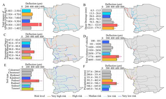 The segment-based risk detector reveals the road segments with pavement deflections at high or low risks in different sub-regions of variables. The risks of pavement deflections are calculated using the segment-based risk detector for variables in the four categories, including vehicles and heavy vehicles (C1, Figure S1), climate and environment (C2, Figure S2), road characteristics (C3, Figure S3), and socioeconomic factors (C4, Figure S4), where the variables that have no significant relationships with pavement deflections are removed. To deeply understand the spatial patterns of pavement deflections at high or low risks, five levels of risks are defined for the sub-regions of variables, including very high risk, high risk, medium risk, low risk and very low risk. The definitions and descriptions of pavement infrastructure performance risk levels are listed in Table 4. According to the definition, risks of pavement damage are directly linked with the sub-regions of variables. In this study, the variables with the top six values identified by the segment-based factor detector are used as examples for illustrating the risk distributions of pavement infrastructure performance. The six values include total masses of vehicles, soil deep drainage, percentage of heavy vehicle mass, total volumes of vehicles, soil type and annual precipitation. The six variables have the largest relative contributions () and they are included in 18 of the top 20 interactions. Figure 9 shows the levels of risks within sub-regions of variables and the corresponding spatial distributions at high or low risks. For instance, road segments with very high risk associated with the total masses of vehicles are primarily located at the southern part of Brand Highway. Road segments of high risk are located at Brand Highway, Great Northern Highway, Great Eastern Highway and Albany Highway, and other road segments are at low risk. For the sub-regions determined by soil deep drainage, road segments at very high risk are primarily on Brand Highway, and those at very low risk are distributed on the southern part of Great Northern Highway, western part of Great Eastern Highway, and Albany Highway.