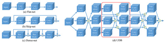 As shown in Figure 1d, on the basis of the dense network [26], we propose a multiple-path residual block called UDB. Compared with conventional skip or dense networks [24,26,27,29], UDB contains richer short and long paths with the same convolution layers. In particular, given the multiple-path units and transition layer, the feature channels becomes shallower, extremely reducing the parameters and decreasing the computational burden and memory consumption.
