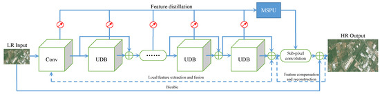 According to previous SISR algorithms [24,27,29,30], the output of the current stage is directly transmitted to the next stage. Then the final residual maps are obtained at the top layer for SR reconstruction. However, information loss is inevitable during its propagation in the network, thereby weakening the continuity of information propagation. Previous works add a set of nodes to shorten the transmission distance, thus boosting information propagation and reducing information loss during propagation, so-called skip connections [24,29]. However, increasing the nodes between the input and the output cannot only deepen the network but also increase computational burden and memory consumption. Differently, we facilitate information propagation with the multiple-path residual module UDB. Furthermore, we also present a distillation and compensation strategy for fine feature expression by compensating for extra-high-frequency details. As shown in Figure 3, unlike the traditional network, whose output in each block is directly transmitted to the subsequent part, our proposed method can adaptively distill and preserve the feature maps by partly choosing information from the current output yet retain its integrety. Then, these feature maps collected from different stages are aggregated and purified in MSPU to infer and compensate for the high-frequency details before the reconstruction operation.
