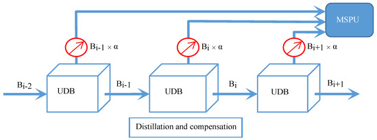 The distillation and compensation mechanism. The red components indicate that the distilled feature maps in current UDB are adaptively preserved. denotes the distillation ratio for current UDB output . MSPU refers to the further purification operation.