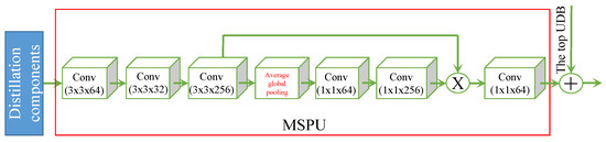 In this study, we adopt the SE module because of its promising efficiency and efficacy. On the basis of this finding, we propose an applicable module MSPU for information compensation. The basic structure of MSPU building unit is illustrated in Figure 4. Contrary to the squeeze-and-excitation network (SEN) [44], the redundant residual connections between SE blocks used for features transmission are removed. In addition, given that the full connection layer can destroy the internal structure of the image, we therefore replace it with a 1 × 1 convolution layer. Moreover, we adopt a robust activation function, e.g., parametric rectified linear unit (PReLU), to replace the previous version rectified linear unit (ReLU).