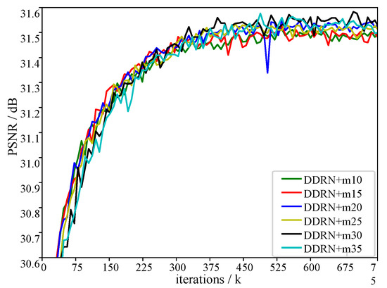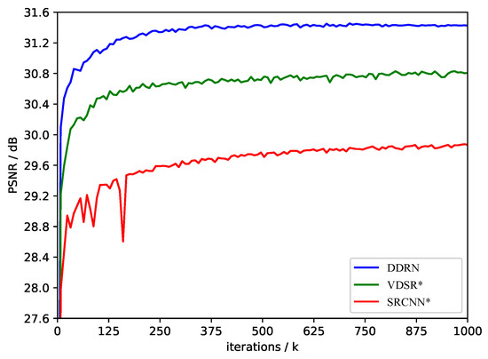 In light of the observations in these previous works [26,27,28], fine features can be well inferred from a deep CNN framework. Thus, we gradually increase the depth of the network by simply adding the number of the UDB (i.e., m is set to 10, 15, 20, 25, 30, and 35). We assess the performance of different values of m. In Figure 8, we show the training details of the proposed DDRN+ method with different depths. When simply increasing the value of m to 30, the improvement gradually increases and surpasses the basic module by approximately 0.22 dB in the scale of 4. By contrast, the performance declines when we continue to increase m to 35 and the network exhibits slow convergence. This result can be mainly attributed to the overfitting, and the convergence of the network becomes more difficult in such a depth.