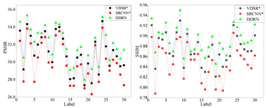 In Figure 6, we show the evaluation results of the proposed DDRN method and the comparison algorithms on the Kaggle Open Source Dataset to verify the usefulness of the ultra-dense connections strategy further. The test set contains 30 different scenarios, which are labeled 1 to 30 in Figure 6. The figure shows that by using ultra-dense connections, we obtain better reconstruction results than do the conventional CNN-based methods, i.e., SRCNN [23] and VDSR [24]. For the average PSNR, our DDRN shows substantial improvements, surpassing VDSR by 0.92 dB, and SRCNN by 1.94 dB. Similarly, SSIM is also considerably improved.
