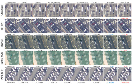 The reconstruction results obtained with above mentioned Kaggle Open Source Dataset for the proposed approaches and the comparison methods are shown in Figure 9. We select several different but representative scenarios (i.e., crossroads, factory, freeway, tennis court, and parking lot) to produce a visual presentation. Experimentally, we crop these representative scenarios into a sub-batch with the size of 120 × 120 pixels from each reconstructed SR image and compute PSNR and SSIM. Notably, the proposed method DDRN and its improved version DDRN+ surpass these state-of-the-art methods by a large margin. Moreover, the modules that we propose exhibit the most accurate and realistic image details from the visual effect. Most of the comparison methods produce noticeable artifacts and blurred edges, whereas the proposed DDRN+ can recover sharper and clearer edges because of successful feature extraction and fusion, more faithful to the ground truth. For example, as shown in Figure 9, only our proposed modules restore the clear court boundary in the tennis court scenario and the accurate and credible car outline in the four other scenarios. Therefore, all of the proposed models exhibit solid performance improvements compared with the conventional direct- or skip-connection-based algorithms [23,24,25].
