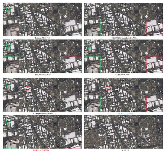 Furthermore, we perform a set of realistic SR reconstruction experiments for the unknown real degradation process (i.e., using the observed LR images instead of the downscaled LR images as input). These test images are randomly selected from Jilin-1 satellite imagery using the same preprocessing to acquire the test images with the size of 480 × 204. Then, the processed images used as the LR input are directly transmitted to the network to obtain the reconstructed HR images. The comparison results with other state-of-the-art algorithms are shown in Figure 11 (we show only one example due to space constrains). Evidently, most of compared methods [23,24] produce noticeable artifacts and blurred building outlines, whereas the proposed DDRN and DDRN+ yield better results with fewer jagged lines and ringing artifacts. Instead of the commonly used evaluation metrics PSNR and SSIM (because the original HR images are unavailable), we introduce the AG to measure the sharpness of the SR results. As shown in Figure 11, the proposed modules DDRN and DDRN+ enjoy the second and first highest AG scores, respectively. The results for real video satellite imagery indicate that our model is more robust than the comparison methods in super-resolving the image with unknown degradation process.