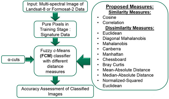 Fuzzy set theory introduced by Zadeh [10] uses the concept of uncertainty in the definition of a set by removing the crisp boundary concept into a function of the degree of membership or non-membership [11]. Fuzzy logic using fuzzy set theory provides important tools for data mining and to determine the data quality, and also has the ability to present data that contain vagueness, uncertainty and incompleteness [12]. This is especially observed if the databases are complex. Classifiers based on fuzzy set theory like the fuzzy c-means classifier (FCM) [13] has been studied with weighted measures such as the Euclidean measure, Mahalanobis measure or a diagonal Mahalanobis measure for solving mixed pixel problems in remote-sensing images [14]. Earlier, other measures of similarity and dissimilarity measures such as the correlation, Canberra, Cosine distance, etc. were not studied with the FCM classifier. In this work, these measures were studied with the FCM classifier. Common statistical analyses have been used in the past to calculate similarities for a fuzzy set, like the work of Lopatka and Pedzisz [15] and also Besag [16]. However, these analyses have been heuristic and are rather general. Therefore, it is important to consider the analysis of vague and ambiguous data with a degree of membership. α-cuts have been used to obtain a better calculation of the distance between the fuzzy sets and also to avoid or check the overlap between the cluster centres [17,18].