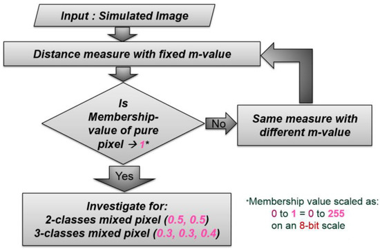 If A is a fuzzy subset of universal set X, then the α-cut set of the fuzzy set A will be written as A[α] and is defined as {x ∈ X|A(x) ≥ α}, for 0 < α ≤ 1. The α equals to 0 cut, or A[0], should be defined separately because {x ∈ X|A(x) ≥ 0} is always the whole universal set X [22]. The concept of α-cut is to create a threshold for the membership value of a pixel in the concerned class. The outputs obtained from both the single or composite use of similarity and dissimilarity measures were checked on α levels from 0.5 to 0.9 with an interval of 0.1. The value of α-cut was restricted from 0.5 to 0.9 because if the value of α is below 0.5, then there will be an overlap of the degree of membership of a class for a pixel and if the value of α is 1, then it represents the centre of the cluster of the concerned class [23]. The outputs obtained at different α levels for both single and composite measures were evaluated for their accuracy to obtain the best α-level. The algorithm was implemented by using the distance measure with Equations (9) and (10) [23]: