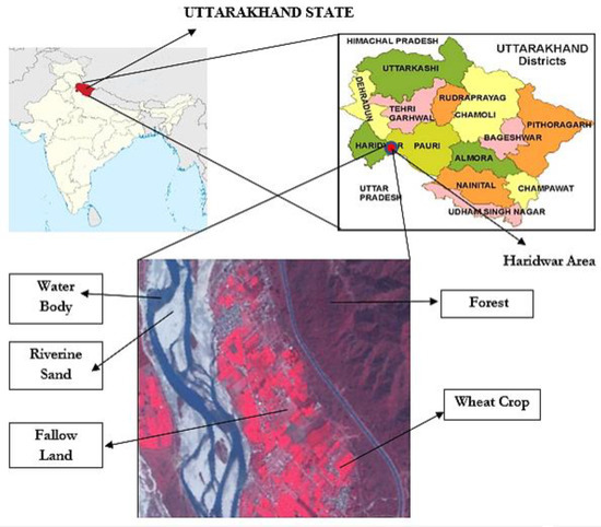 The study area selected for this project work was in the district of Haridwar, Uttarakhand, and is shown in Figure 3. The district shares its boundaries with Dehradun in the north, Pauri Garhwal in the east while, west and south are bounded by districts of Uttar Pradesh. The central latitude and longitude of the district are 29.956°N and 78.170°E respectively. The coverage of the area is 2.664 km × 2.192 km in the east to west and north to south direction respectively. The land is fertile with river Ganga flowing through the district and agriculture remains the mainstay of the district. Five classes that were considered as follows: water, riverine sand, wheat crop, forest, and fallow land. This study area was selected due to the diversity of land-use classes, such as vegetation type (wheat), riverine sand, forest, fallow land and water. There is also the presence of mixed pixels at the boundaries of the classes and this will help to examine the capacity of FCM classifier with different similarity and dissimilarity measures for classification. Ground truth data of the study area were available as the field visit was conducted on 16 March 2015. Data sets from the sensors Formosat-2 and Landsat-8 were also available in the same time frame as to check the image to image accuracy of the classifier. Formosat-2 and Landsat-8 sensor images were acquired on 21 February 2015 and 12 February 2015, respectively.