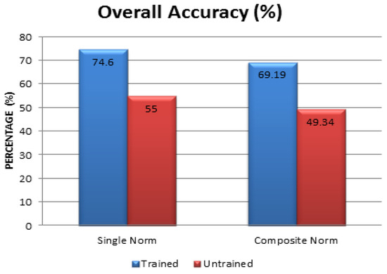 During the training stage of a classifier, some classes were ignored resulting in the untrained class. The untrained classes depict the higher degree of membership for classes which are spectrally different and hence, resulting in a drop in the accuracy of the classification [50]. In this work, for the developed FCM classifier, the mean values of wheat for Landsat-8 datasets were not considered for training. Figure 9 compares the overall accuracy results of both single measure as well as a composite measure for both trained and untrained cases, respectively. The results obtained after accuracy assessment in Figure 9 showed that the overall accuracy for trained classes was more than the untrained classes ranging from 49% to 55% for single and composite measures, respectively. These results showed that the removal of a class (wheat) for an untrained class reduced the overall accuracy; however, the trend was constant like in a trained dataset.