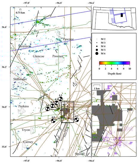 Prior to 2009, seismicity in Oklahoma was concentrated along the Meers fault zone, southwest of the recently reactivated Nemaha and Wilzetta fault zones []. Since seismicity initiated in Cushing in 2014, three earthquake sequences have ruptured two fault zones (Figure 1). The October 2014 sequence, just south of Cushing, consisted of two moderate sized, shallow earthquakes, a Mw 4.0 on 7 October followed by a Mw 4.3 on 10 October []. The aftershock alignment revealed the reactivation of the unmapped Cushing fault, a 5 km long, N80W striking, left-lateral, strike-slip conjugate fault within the Wilzetta–Whitetail fault zone [].