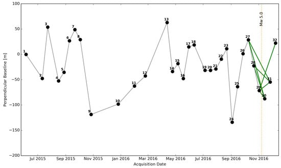 Perpendicular baseline plot for pairs (solid lines) showing acquisition dates (circles) and 2016 Mw 5.0 Cushing earthquake (vertical gold dashed line). Gray lines are the preearthquake pairs used in time series analysis while green lines are coseismic pairs used for source inversion.