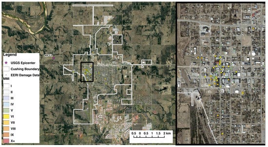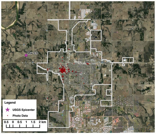 We assess the damage caused by the Mw 5.0 event by analyzing damage data collected by the Earthquake Engineering Research Institute (EERI) reconnaissance team following the 7 November 2016 earthquake. The EERI Clearinghouse database [] consists of over 1400 photos of damage for the 2016 Pawnee and Cushing earthquakes (Figure 3). Each of these photos contains information including the latitude and longitude, and a description of damage.