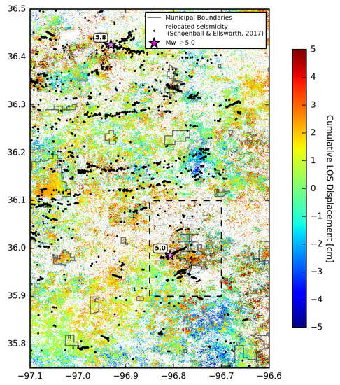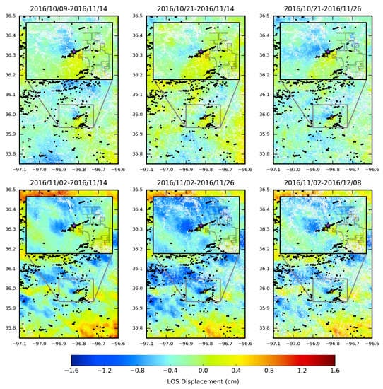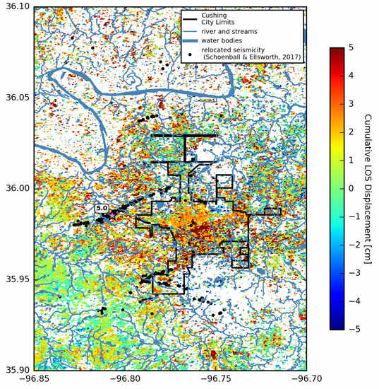 - Loesch, E.; Sagan, V. SBAS analysis of induced ground surface deformation from wastewater injection in east central Oklahoma, USA. Remote Sens. 2018, 10, 283. [Google Scholar] [CrossRef]