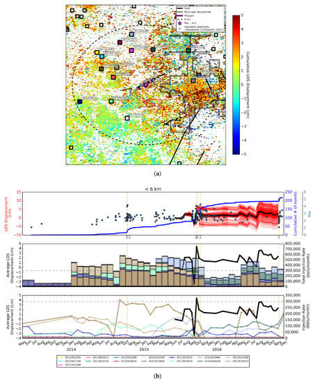 Cumulative displacement image for selected region near the Mw 5.0 earthquake. (a) cumulative displacement image for selected region (purple polygon). Also overlaid are injection wells (black squares), faults [], and relocated seismicity [] (black dots). Relocated M4+ earthquakes (magenta stars) and wells within 6 km of polygon (dashed line) are also plotted and labeled. (b) all three plots feature the average LOS displacement time series for the polygon (black line) and dates of M4+ earthquakes within 6 km (gold vertical dashed lines). Top: LOS displacement time series for each of the pixels within the polygon (transparent red lines), cumulative number of earthquakes within 6 km (blue line), and earthquake magnitudes (light blue circles). Middle: Total monthly injection rate for the 15 injection wells within 6 km of the polygon. Bottom: Individual well monthly injection rates for the 15 wells within 6 km of the polygon.