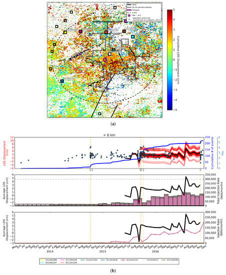 The surface displacement time series spans 5 June 2015 to 2 November 2016, ending five days before the Mw 5.0 earthquake. The cumulative displacement time series image reveals a broad region of 4 to 6 cm of uplift across the city of Cushing (Figure 4) over 17 months. The broad deformation signal does not correlate with topography nor streams, rivers, or other waterbodies. These waterbodies, which are common sources of noise, do correlate with areas of decoherence (Figure 5). Other broad regions of uplift are also observed in the cities of Stillwater and Perkins. We extract time series for pixels within two regions of interest, the Mw 5.0 earthquake (Figure 6) and downtown Cushing (Figure 7). We compare the displacement time series to seismicity using the Schoenball and Ellsworth [] waveform-relocated earthquake catalog from May 2013 to November 2016, with a magnitude of completeness of 2.6. Note that the October 2014 Mw 4.3 earthquake featured in earlier figures was downgraded to a Mw 4.2 in the relocated earthquake catalog. Figures, henceforth, will reflect the downgraded magnitude. In addition to seismicity, we also compare the displacement data to monthly injection rates of of class II (oil and gas-related) Underground Injection Control (UIC) wells from the Oklahoma Corporation Commission (OCC) []. Wells are split into two types, type 2R for Enhanced Oil Recovery and type 2D for Salt-Water Disposal (SWD). Any well injecting above 300,000 bbl/month is classified as a high-rate injection well. A summary of the UIC wells within 6 km of our regions of interest are presented in Table 4 and Table 5. Wells that have injected or are currently injecting into the Arbuckle have an additional column of information, injection period, where the table lists the time period that the well was injecting into the Arbuckle before the well was plugged and recompleted into a shallower formation, typically the Wilcox formation.