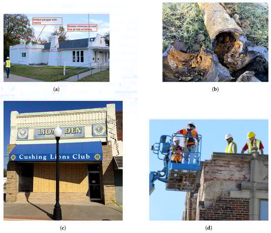 Examples of characteristic of MMI VII damage from the 2016 Mw 5.0 Cushing earthquake. (a) Damage to the unreinforced masonry American Legion building in Cushing, showing a drifted parapet and chimney broken at roof line and at risk of falling. Although not shown, the back wall fell out. (b) Damage to a water main at North Route 18 showing complete pipe burst potentially due to permanent horizontal and vertical ground deformations. (c) Damage to the unreinforced masonry Lion’s Den in Cushing, showing severe racking at approximately 3 degrees, and separation from the adjacent building. The building collapsed completely a short time after the earthquake. (d) Damage to the Cimarron Tower in Cushing, showing spalling from the exterior facade and parapet. Although not shown, a water line inside the building broke during the earthquake and was not shut off for 24 h resulting in water damage from the 4th floor down. Photos adapted from the EERI Clearinghouse Database [].