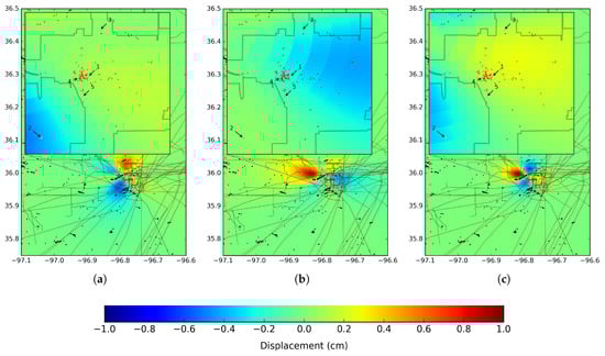 The time series of the cumulative surface displacement in the satellite line-of-sight (LOS) for the preseismic interferograms is constructed using the Generic InSAR Analysis Toolbox (GIAnT) software []. In GIAnT, we mask pixels whose phase coherence is less than 0.35, we correct for the atmospheric phase delay using the European Centre for Medium-Range Weather Forecasts (ECMWF) global atmospheric model, and we deramp the interferograms. After applying the corrections, we generate the time series using the New Small BAseline Subset (NSBAS) algorithm []. We select a reference region in the town of Carney, southwest of Cushing. This region was selected to ensure coherence over the time series.
