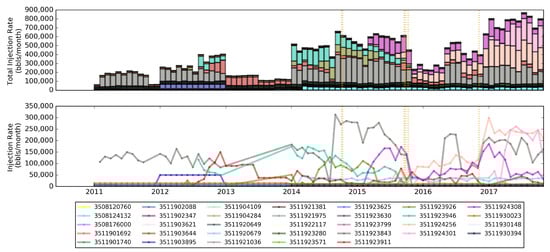 Figure 15 presents injection data for all UIC wells within 10 km of downtown Cushing. Data for the resulting 33 UIC injection wells dates back to 2011. Although we cannot comment on the source of the regional uplift from 2006 to 2011, we do see a significant increase in total injected volume per month starting in 2014 and peaking in 2015. From 2011 to 2018, only a single UIC well, API 3511923843, injects at high-rates. The period at which API 3511923843 injects at high-rates into the Arbuckle immediately precedes the 2014 earthquake sequence.