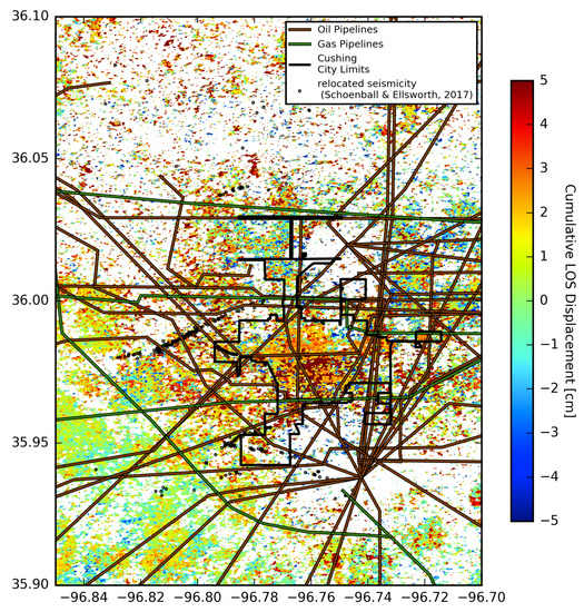 Cushing, Oklahoma, the “pipeline crossroads of the world,” is home to the largest crude oil storage facility in the United States and the Keystone pipeline. Wastewater injection threatens this critical national energy infrastructure through both large, instantaneous ground acceleration from induced seismicity and through smaller, incremental, longer term movement from ground surface deformation [].
