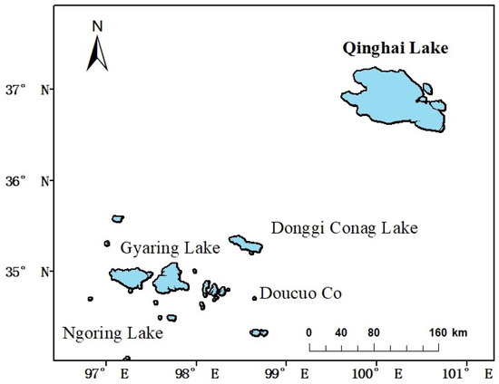 As shown in Figure 4, the study area (96.6° and 102.4°E, and 34.2° and 38.8°N) mainly covers Qinghai Lake, Gyaring Lake, Ngoring Lake, and Donggi Conag Lake, in Qinghai Province, China. These lakes, as well as the surrounding wetlands and estuaries, serve as a critical breeding ground and migratory staging area for many kinds of migratory waterfowl, especially the Bar-headed Goose (Anser indicus). This special species gained political and scientific attention following the large outbreak of highly pathogenic H5N1 avian influenza at Qinghai Lake area in the spring of 2005 [47,48]. This single event is the first large-scale outbreak of avian influenza. It caused the death of nearly 5% of the global population of Bar-headed Geese [49], which sparked a global debate on the role that wild birds play in the spread of H5N1 [50].