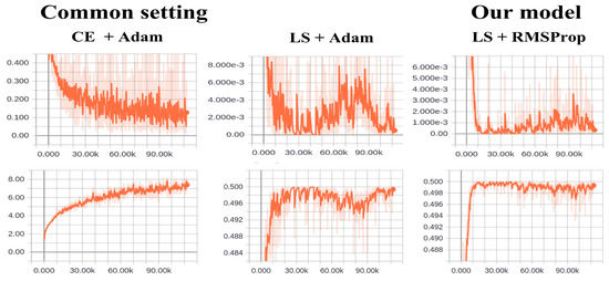 We find that the loss curves of the Cross-Entropy (CE) loss and Adam optimizer are highly-fluctuated, especially for the discriminator. They also have a slower convergence than two least-squares models. The second combination shows that applying the Adam optimizer on least-squares loss is not a good choice even though least-squares (LS) loss can still lead to a fast convergence. Our model (LS loss + RMSProp) achieves a fast convergence and more stable training for both the generator and discriminator, which confirms the previous report [43] that the optimizers without momentum perform better in the LS loss.