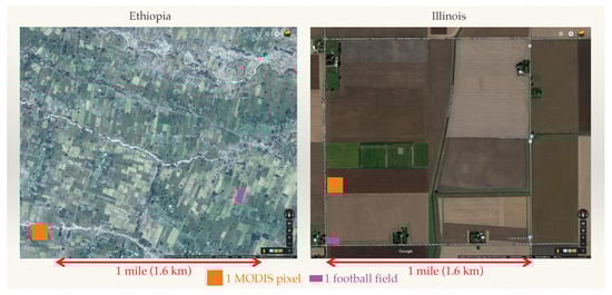 Farm fields by satellite in Ethiopia and Illinois at the same resolution. In Africa, small farm fields (smaller than a MODIS pixel) and poor ground truth data increase the difficulty of analyzing and predicting crop yields. Images are from Google Maps.
