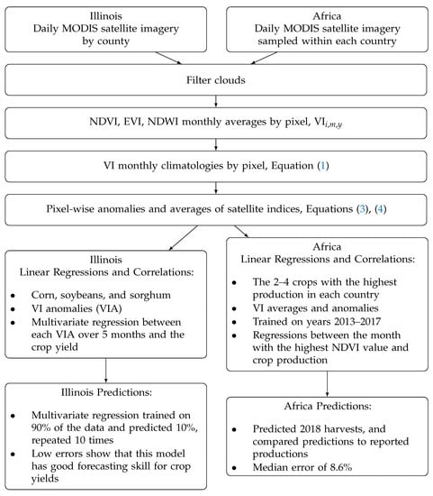 The primary goal of this research is to create a predictive measure of crop yields computed from satellite data. Python code was written to obtain satellite images, mask out clouds, calculate vegetation and water indices (VI), compute monthly VI anomalies since 2000, and correlate the anomalies with crop yield anomalies for every county in Illinois, which served as a proof of concept due to large amounts of ground truth data in the US. The same method was then applied to every country in Africa to create an early indicator of crop yields. The overall workflow is diagrammed in Figure 2 and is described in detail in this section.