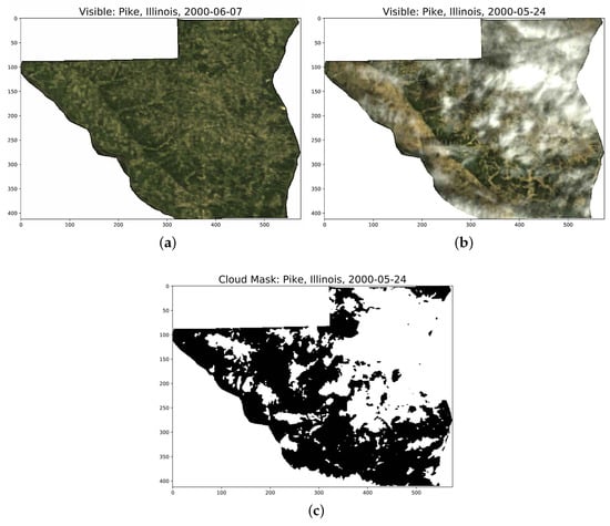 Snapshots of two MODIS satellite passes over Pike county, Illinois (a,b); and the cloud mask for the second image (c). Axes labels show MODIS pixels. Daily MODIS imagery was retrieved for every county in Illinois for 2000–2017 from the Descartes Labs Satellite Platform [].