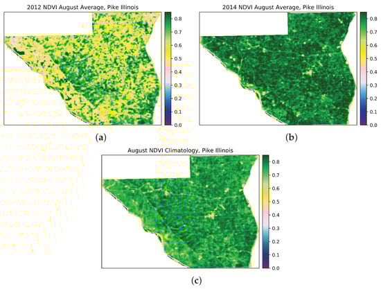 where indicates an average over years, is a spatial average over pixels, and VIA is the vegetative index anomaly. For Illinois, the climatology is defined as the average VI over 2000–2016 for each month and pixel (Equation (1)). Next, the monthly climatology is subtracted from the monthly average for every pixel, resulting in the monthly anomaly (Equation (2)). The pixels in each county are averaged together to find the county-wide monthly anomaly (Equation (3)) and county-wide monthly average (Equation (4)). Figure 4 shows examples of the NDVI monthly average and climatology for Pike County, Illinois. The difference between a dry year and a wet year can be clearly seen in comparison to the climatology.