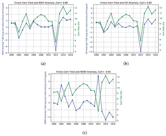 Illinois mean corn yield since 2000 (green) correlated with the anomalies of July and August: NDVI ((a), blue); EVI ((b), blue) and NDWI ((c), blue). Soybeans and sorghum performed similarly. Reported yields are from the USDA [], and anomalies are computed from daily MODIS imagery using Equations (1)–(4).