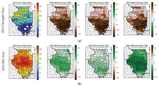 Corn yield (Column 1), NDVI anomaly (Column 2), EVI anomaly (Column 3), and NDWI anomaly (Column 4) by county in Illinois: for the drought year 2012 (a); and for the wet year 2014 (b). During the drought year, there are low yields, low NDVI and EVI anomalies, and high NDWI anomalies, while the wet year is opposite. Soybeans and sorghum performed similarly.