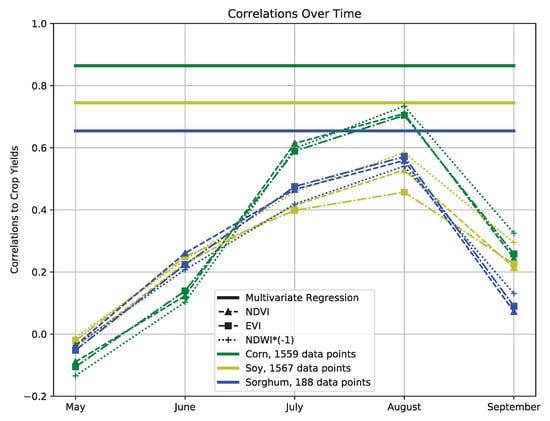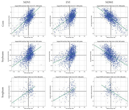 Next, the relationships were examined at a higher resolution. The corn, soybean, and sorghum county yield data were plotted against VI anomalies for every month (May–September), county, and year (2000–2017), for a total of about 1600 data points. August was found to have the highest correlation to all three crops, while July was just slightly lower (Figure 7). Since crops are harvested in October [], there is a two to three month lead time on yield estimates. Corn had the strongest relation to the VIs with correlations of , , and for EVI, NDVI, and NDWI, respectively. Soybeans and sorghum had similar correlations to indices, both ranging from to . To see all of the correlations in more detail, refer to Figure 8. All of July’s and August’s correlations had a p-value less than [], meaning there is less than one in a million chance of them occurring through a random process.