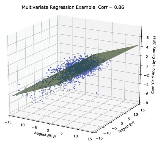 Correlations for each crop have been computed with three indices (NDVI, EVI, and NDWI) and five months, for a total of fifteen independent variables. To create a single predictive measure of crop yields, a multivariate regression was fit to every index and every month using a Python machine learning library. Figure 9 shows an example of the multivariate regression for two of the variables and corn yield. The multivariate regression improved the individual correlations for all three crops to 0.86, 0.74, and 0.65, respectively (solid horizontal lines in Figure 7).