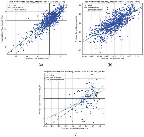 Accuracy of the multivariate regression predictions of yields in Illinois for corn (a), soybeans (b), and sorghum (b). Each point shows the predicted yield versus the reported yield for a single county and year. The model was trained with a randomly selected 90% of the data and then predicted the other 10%. This process was then repeated ten times to ensure randomness. The median error (Equation (6)) was lowest for corn with 5.7%, soybeans was similar at 5.8%, and sorghum had the worst error with 21.9%.