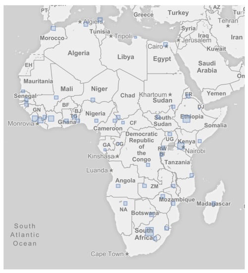 - Petersen, L.K. Dense Farming Regions in Each African Country. 2018. Available online: https://gist.github.com/lillianpetersen/6b2227bad0c44d0a9565c717e6f178d3 (accessed on 30 October 2018).