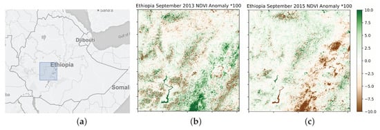 The box examined in Ethiopia (a) and its September NDVI anomalies during a wet year (b) and a dry year (c). The NDVI anomalies are particularly evident in the Rift Valley, where farming is the most dense.