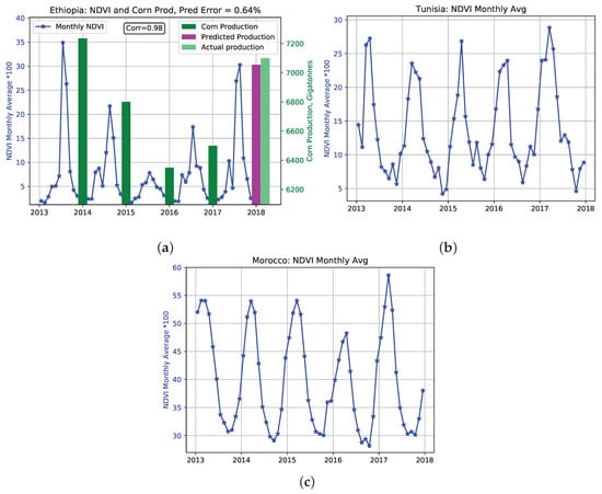 NDVI monthly average for: Ethiopia (a); Tunisia (b); and Morocco (c). The annual rainy season produces high NDVI values and corresponds to the crop-growing months. To show an example of correlations, Ethiopia includes the corn production as green bars, which has a very high correlation to maximum NDVI at 0.98. Production data were retrieved for every country from Index Mundi [].