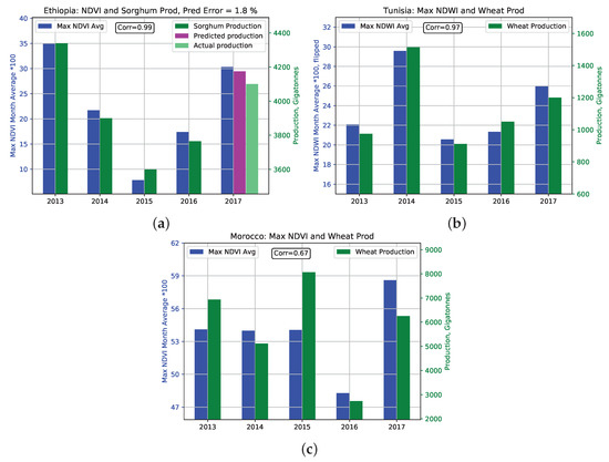 Ethiopia’s maximum NDVI values, which usually occur in August, are extremely well correlated with grain production at 0.98 and 0.99 for corn and sorghum, respectively (Figure 13a and Figure 14a). That is a near-perfect correlation between the crop production harvested in December and satellite imagery four months earlier. Tunisia and Morocco have correlations of 0.97 and 0.67 to wheat production (Figure 14b,c), showing high predictive skill of satellite indices in all three countries.