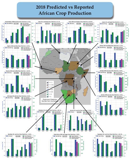 In each African country, correlations were computed between every crop and six indices (NDVI, EVI, NDWI, monthly averages and anomalies). A full listing of all correlations can be found in Table A1 in the Appendix A. Next, the historical regressions were used to predict crop production for 2018 harvests. Every country that reported productions for their 2018 harvest before the publication of this article was examined. This includes harvests ranging from December 2017 (e.g., Ethiopia) through June 2018 (e.g., Namibia), and included a total of 21 countries, about half of Africa. In April 2018, VI anomalies and crop predictions were posted on a publicly viewable interactive map [], and the actual production values were added as they became available in mid to late 2018 (Figure 15).