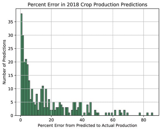 After initial successes in Ethiopia, Tunisia, and Morocco, the method was expanded to every African country with the exceptions of Western Sahara, Equatorial Guinea, and Gabon due to lack of crops or constant cloud cover. Satellite data were restricted in this study to 2013–2018 based on the limited download and compute time that is available to a typical home user on a modern-day laptop. The satellite imagery processed in Africa totaled 10 terabytes even with only five years of data. Future production was then predicted for every African country with a harvest between December 2017 (e.g., Ethiopia) and June 2018 (e.g., Namibia). Harvest dates were obtained from the FAO’s GIEWS []. Later, once actual production values were published, the error of the predictions in every country and crop was computed. The error is defined as