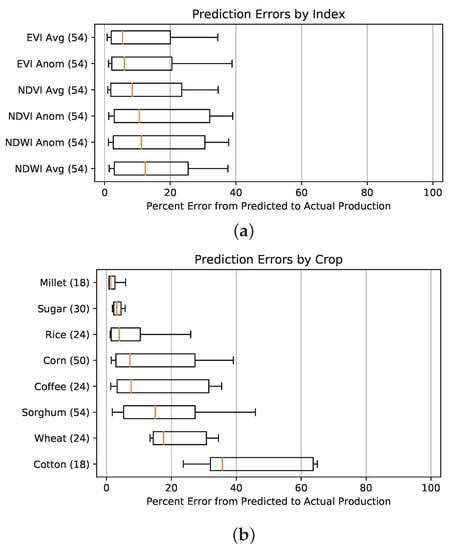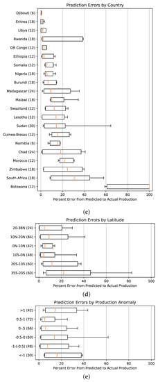 The errors of the 2018 predictions examined in five categories: vegetation index (a); crop (b); country (c); latitude (d); and production anomaly (e). Each orange line represents the median error, the boxes represent the ends of the second and third quartiles, and the whiskers show the middle of the first and fourth quartiles. On the vertical axes, the number of samples of each category are in parentheses. A full listing of predictions and errors are in Table A1.