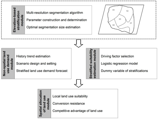 Land use significantly influences the planet’s land surface and associated biogeochemical processes. With fierce conflict between various land uses, it is important to project the land system process to support decision-making. Lack of insight into scale differences of land use change (LUC) increased uncertainties in previous studies. To quantify the differences in LUCs within an elevation gradient, in this study, a novel model, the stratified land use change simulation model (SLUCS), was developed by using an elevation-based stratification strategy. This model consists of four modules. First, an elevation-based stratification module to develop a quantitative method for generating stratifications using elevation and land-use characteristics. Second, a non-spatial land-use demand module to forecast the overall land use area and make zoning constraints to simulate LUCs. Third, a stratified suitability estimation module that uses the stratified logistic regression method to reveal the regional relationship of the driving factors with LUCs at different stratifications. Finally, a spatial allocation of the land-use module, which projects a spatially explicit LUC. The SLUCS model was applied and tested in the Guizhou and Guangxi Karst Mountainous Region. Results validated the effectiveness of the model, and further demonstrated an improved spatial consistency with the reference, a higher accuracy assessment, and a better simulation performance in conversion areas than the traditional method. Three scenarios from 2015 to 2030 with different land-use priorities were designed and projected. Each scenario presented the same LUC trends, but with different magnitudes, including the rapid expansion of built-up land, the restoration of forest and water, and the loss of farmland and grassland. Priority of the socioeconomic development and ecological protection of the scenarios forecasted a sharper increase in the built-up land and in forests than the historical extrapolation scenario. The SLUCS model visually projected the LUC trajectory and competition between land uses, which suggests specific tradeoffs among management strategies to support sustainable land uses.