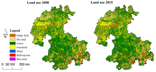 Forest, dry land, grassland, and paddy field ranked as the top four of land-use areas, which accounted for 97.86% and 96.95% of the total area in 2000 and 2015, respectively (Table 4 and Figure 3). Figure 3 shows a net increase in forest, water, and built-up land, but a decrease in paddy field, dry land, grassland, and bare land from 2000 to 2015. Compared to a relatively small net area of land-use change, we found a drastically mutual conversion of various land-use types in the study area during this period (Figure 4). For example, the net increase area of forest was 729 km2, which is much lower the conversion area between the forest and other land-use types, with a conversion output forest area of 1166 km2 and conversion input forest area of 1895 km2 (Figure 4). Based on land use change areas from 2000 to 2015, the transition probability matrix of land use from 2000 to 2015 was calculated for the SLUCS model input (Table S1).