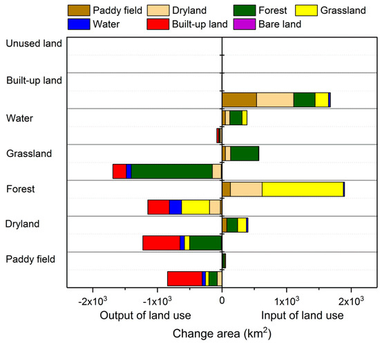 Considerable farmlands were occupied by the expansion of built-up lands, and also conversed to the forest under the Grain for Green Project [60]. Meanwhile, forests and grasslands were reclaimed to the farmlands under the Requisition-compensation Balance Policy of Farmland [61], where the majority of land was reclaimed to dry land, but few to paddy field. The most intense conversion was between forest and grassland. With the ecological restoration project, the forest area significantly increased from the grassland (major source) and farmland, while several forested lands degraded to grassland. The built-up land significantly expanded with a higher change rate of 63.49% than those of others, at the expense of farmland (major source), forest, and grassland. The conversion area of water and bare land is relatively small, where the farmland, forest, and grassland were restored to water while small amounts of bare lands were developed.